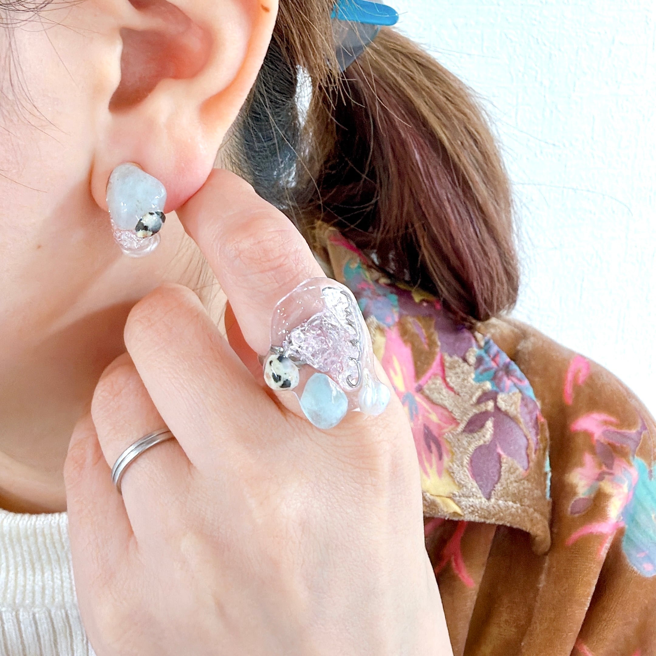 さらに、ハートの石のまわりには、限定ピアス/イヤリングとおそろいのアクアマリン、ダルメシアンジャスパー、淡水パールをあしらい、統一感のある仕上がりになっています。