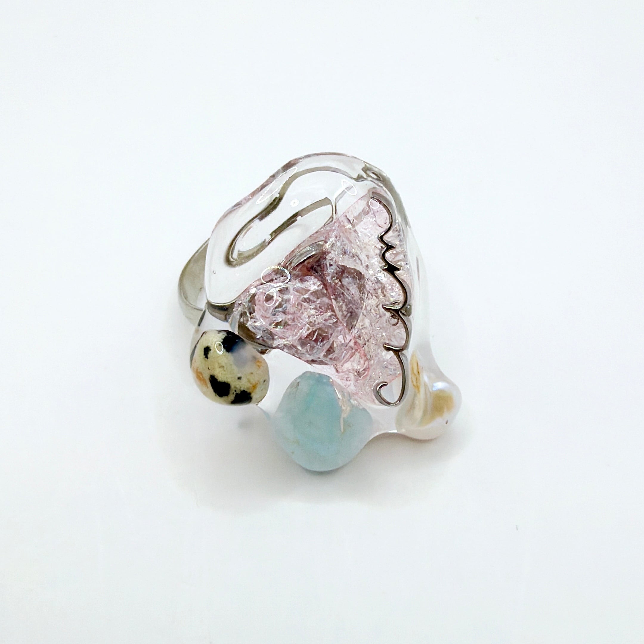 メインのピンクの石には、ペタロに大切に眠っていた天然石を使用しています。