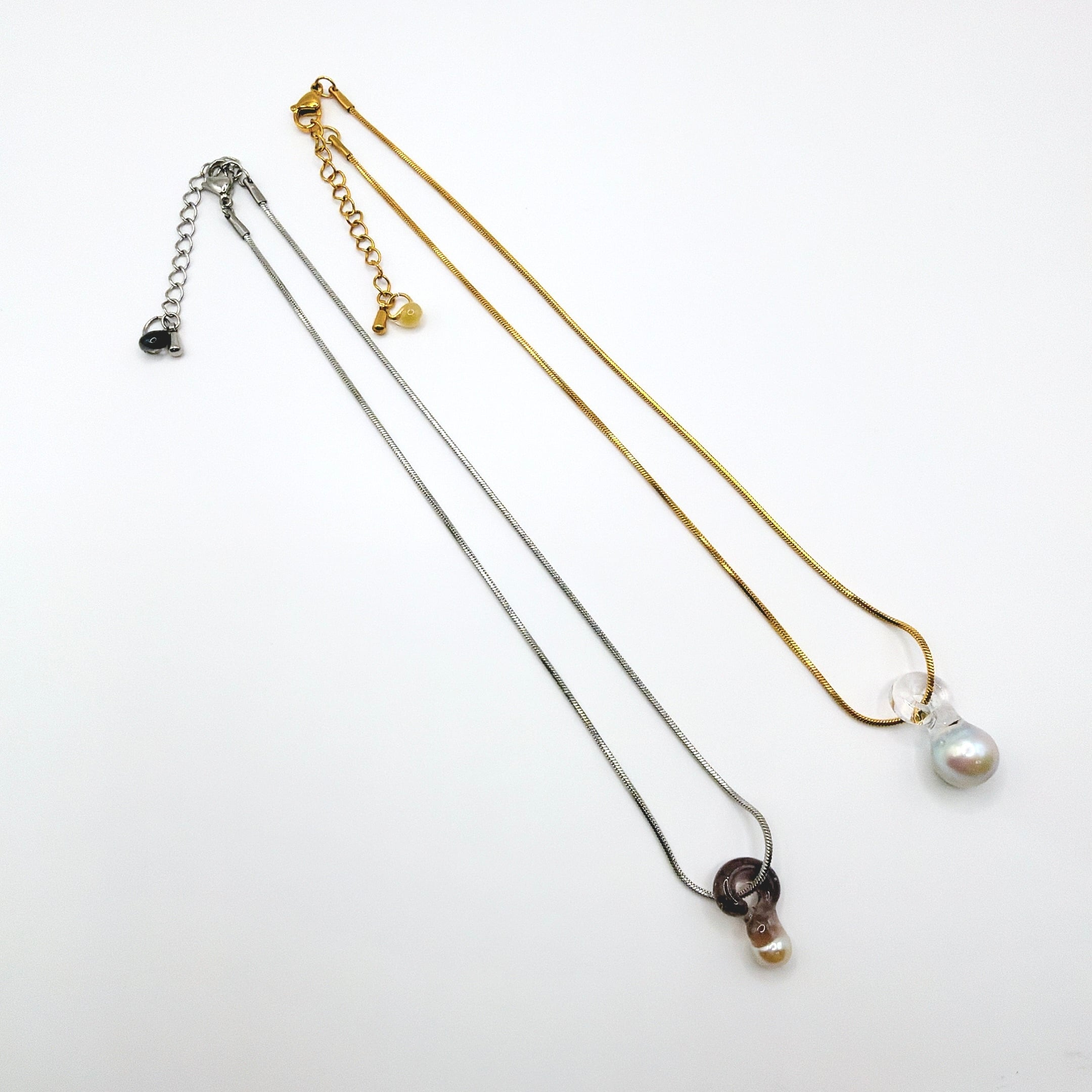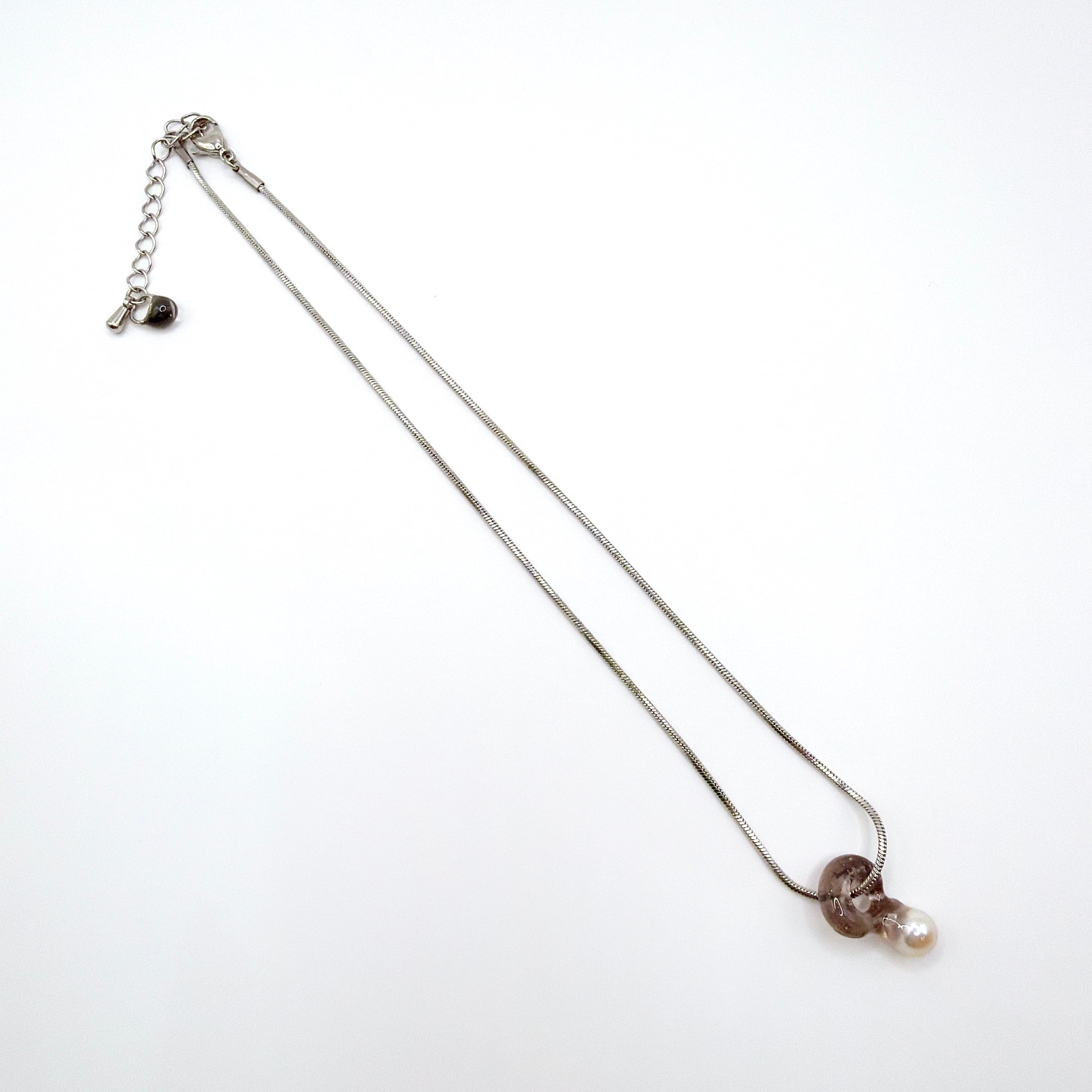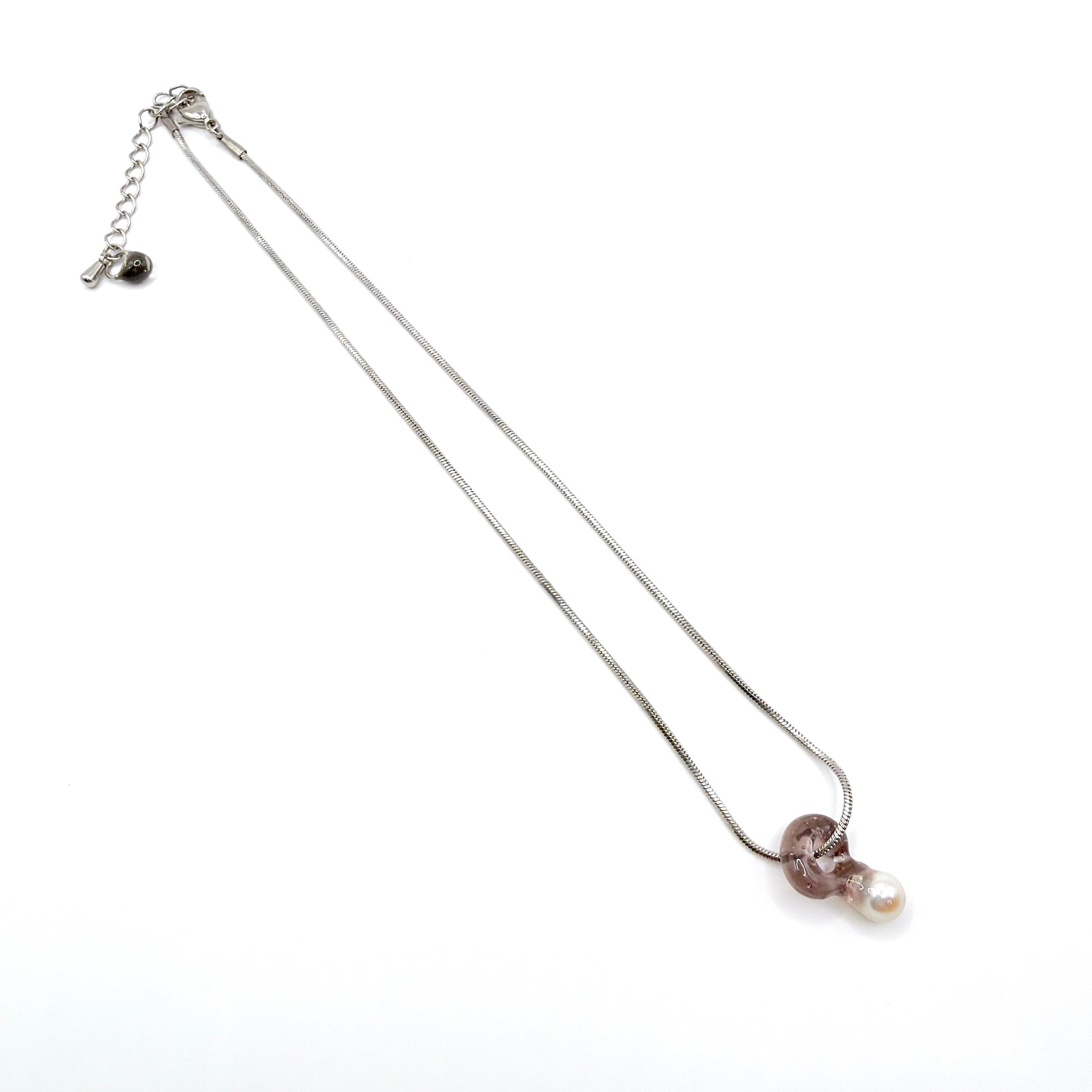 本真珠(バロックパール)を閉じ込めたトップを合わせたネックレス。